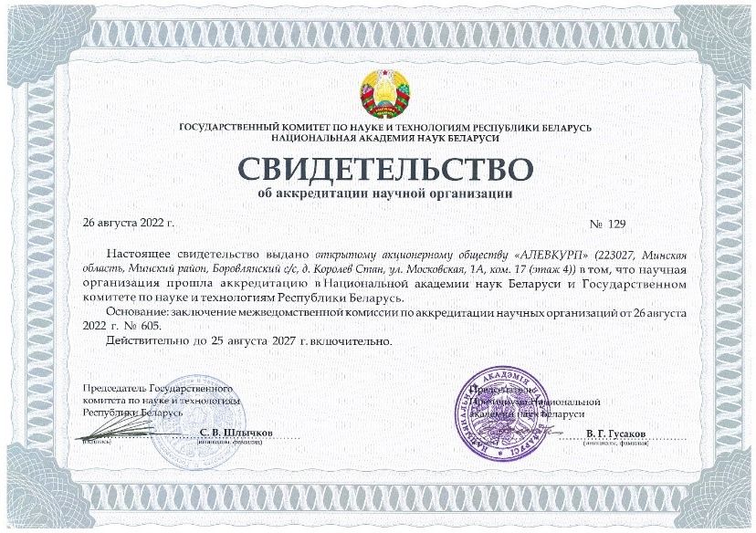 Accreditation took place at the State Committee on Science and Technology and the National Academy of Sciences of Belarus. In accordance with the law "On Scientific Activity", such accreditation is a form of state recognition of the competence of a legal entity in the performance of research, development and technological work. The certificate of accreditation of a scientific organization has become another proof of the high level of scientific, technical and innovative activities carried out at JSC "ALEVKURP". This is the development and modernization of radar systems, control systems using the latest technologies for digital signal processing and information in real time, bringing research and development to the production stage, the development of design and technological documentation.