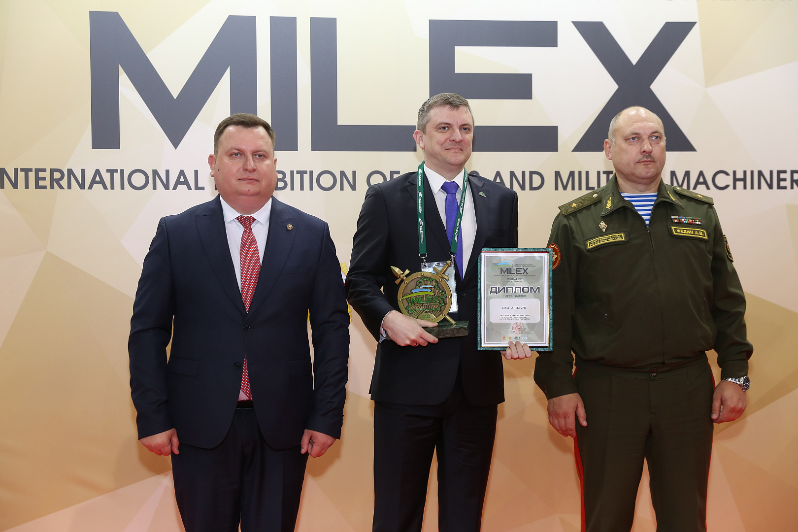 На церемонии закрытия «MILEX-2023» председатель Государственного военно-промышленного комитета Республики Беларусь Дмитрий Пантус вручил директору ОАО «АЛЕВКУРП» Владиславу Новаку диплом за активное участие предприятия в выставке и успехи в области новых научно-технических разработок.